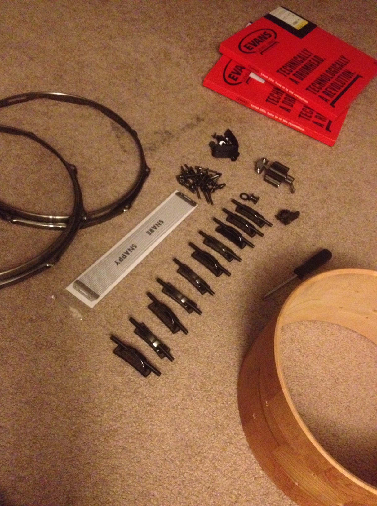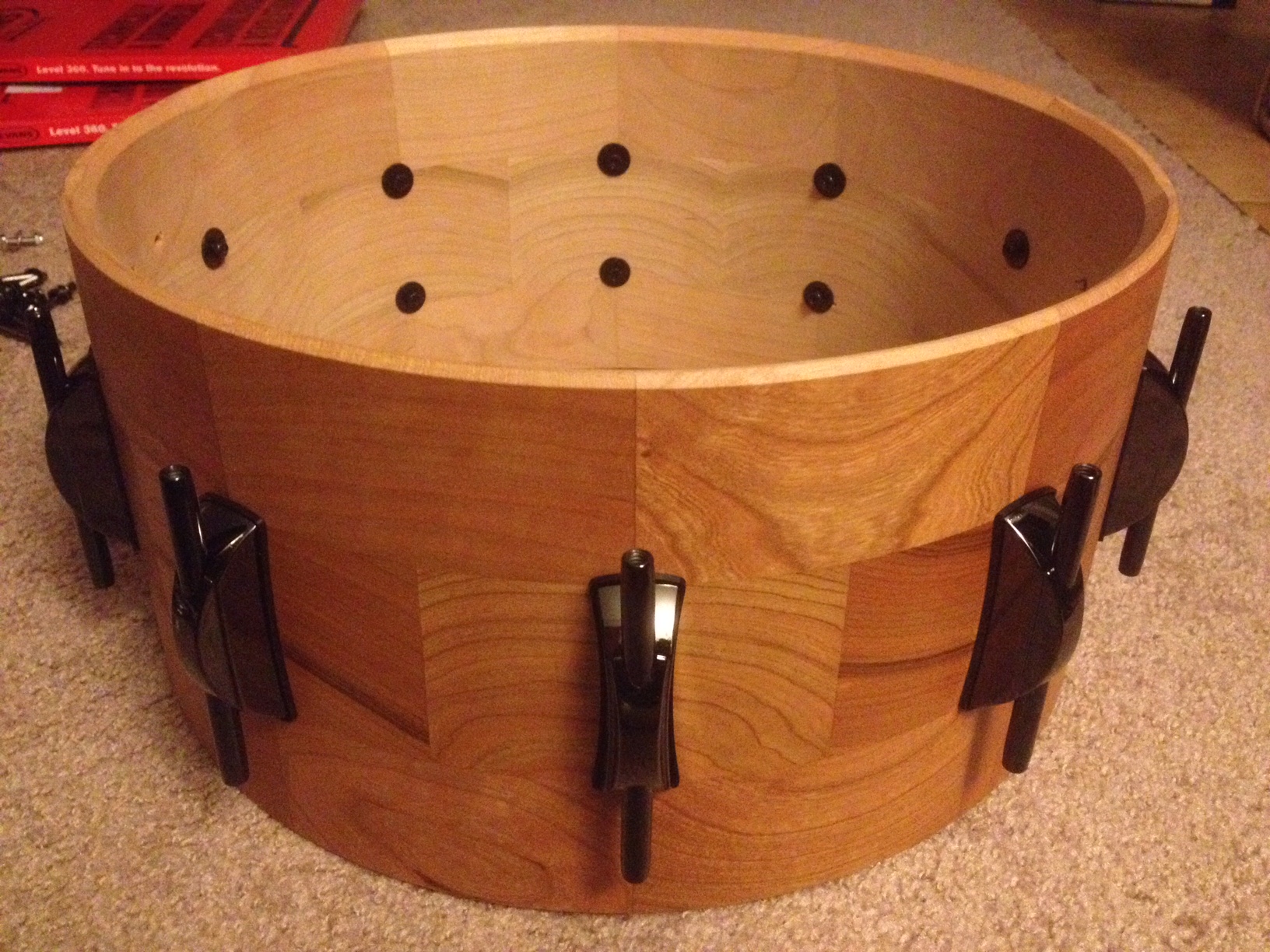 Well a lot has certainly happened since my last post here – got engaged to my amazing fiancé, been in and out of three bands, and learned a lot about myself and my drumming in the process. Since I started working at Steve Weiss Music a couple years ago, I’ve got to know all of the specific things that go into a cymbal or a drum, and that helped me design my own custom snare drum (with some help!). I first had the idea to have a snare that would primarily be used with the snares “off” for that Danny Carey/TOOL sound, but later decided “why not just make an awesome snare all around, on and off?” So from there, everything pretty much fell into place. I had my eye on a custom drum maker who only works with segment shells (not stave, not ply), which really caught my eye, and had some incredible designs and wood combinations going on. So when I saw his company Addiction Drum Design was having a sale on snare shells up to 7″x14″, I jumped at the opportunity and went with that size because a more “beefy” sounding snare would fit well with my other drums and my playing. I chose Cherry wood because I had seen posts about other cherry drums he had made. “Nothing resonates quite like cherry”, is how he put it, so I was very curious at that point. I ran my ideas by him and he seemed to agree cherry would be the best fit. So that was ordered with the drilling, bearing edge, and finish extra. Now to gather all of my dream hardware…